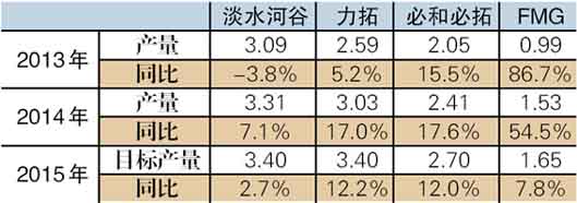 中国钢铁企业进入寒冬,全行业近乎全部亏损。在钢企需求不足情况下,全球前三大铁矿石生产商,力拓、必和必拓、淡水河谷,仍保持了较大的铁矿石产能。各公司2015年第三季度财报显示:力拓三季度销售9134.6万吨,同比增长15.9%;必和必拓三季度销量6533万吨,同比增长4.6%;淡水河谷三季度销售9073.9万吨,同比仅增长2.6%。这三家矿企前三季度累计销售数据分别为2.45亿吨、2.57亿吨、1.97亿吨。另外,排名第四的矿企FMG前三季累计产量也超过亿吨,达到1.25亿吨。从数据可以看出,力拓为增长幅度最大的矿企。(表2