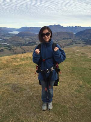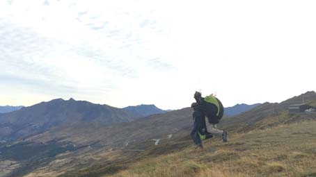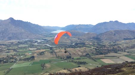 Sky Trek是皇后镇最好的滑翔伞公司之一,提供交通从皇后镇中心接送到飞行地点。起飞点位于皇冠锋,绕着山路接近半小时,到了一个高度大约在1143--1676米的悬崖顶上停下了车。由专业教练帮我穿好了装备后就准备起飞了,背着重重的大袋子,说是一路狂跑,可真的跑不动,最后一刻只感觉被人从身后推了一把,双脚离地,飞了出去,竟毫无失重感。层峦的山峰、翠绿的草坪已在脚下,在湛蓝的天空中任由我翱翔。快降落的时候,看到前面一个自己玩儿的人正在高空中做着各种翻跟头的动作,心血来潮的教练问我想不想试一下?我说好啊!于是,在教练一声“ready?”后,我们便开始腾云驾雾了,正的、反的、圆周的,瞬间的拉升和下降,只觉天空在我眼前旋转,大地在我面前颠倒了方向。