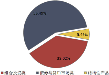 从投向类型来看,债券与货币市场类产品发行了4106款,环比减少233款,市场占比下降1.30个百分点至56.49%;组合投资类产品发行了2763款,环比增加13款,市场占比上升1.39个百分点至38.02%;结构性产品发行了399款,环比减少20款,市场占比下降0.09个百分点至5.49%;融资类产品仍然没有发行。(图4)