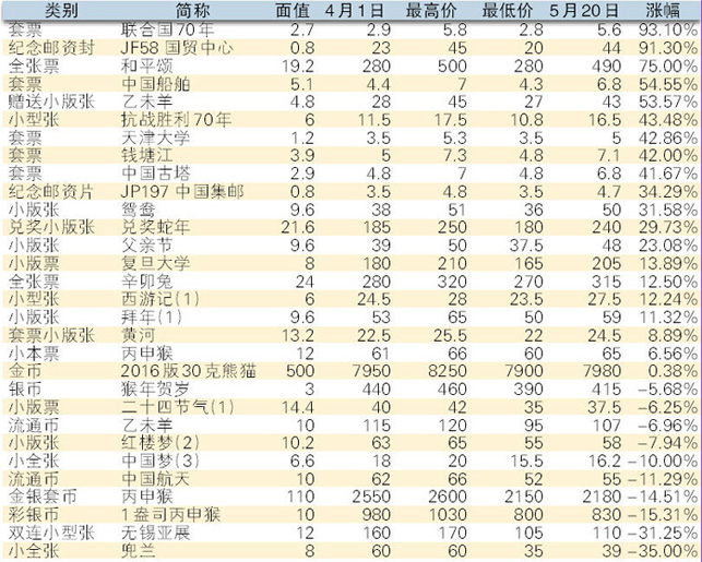 在大量套票纷纷走强的背景下,2016年发行的新邮也成了市场投资者青睐的香馍馍,5月中旬丙申猴套票、全张票、小版张、赠送小版张和小本票价格分别为18元、730元、140元、48.5元和64元,拜年(2套票和小版张分别在3.5元和38元整固,而刘海粟作品选全张票、套票和小版张则分别在170元、6.2元和50元盘旋,中国邮政开办120套票和小全张分别盘旋在4.3元和39元,二十四节气(2套票和小版票分别在10.8元和25元成交,而高逸图全张票、套票和小型张分别在93元、8.5元和18.8元交易,中国古镇(2套票和小版张分别为6.8元和40元,全民阅读套票和小版张分别在3.5元和40元成交。而宋慈唐山园博会交通大学现代科学家(7套票分别上扬至4元、3.6元、4.1元和4.8元。