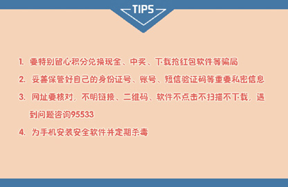 值得注意的是,不法分子往往通过伪基站,任意假冒“10086”、“95533”或卡组织,随机发送诈骗短信,以积分兑换现金、调高卡片额度、系统升级等名义诱导客户登录短信中的钓鱼网站,从而窃取客户卡号、安全码、有效期、动态验证码等重要信息并冒用客户身份盗用账户资金。因而,切勿随意点击短信中附带的不明网址链接,切记建行95533短信无链接。手机动态验证码相当于交易支付密码,绝不告知或转发他人。