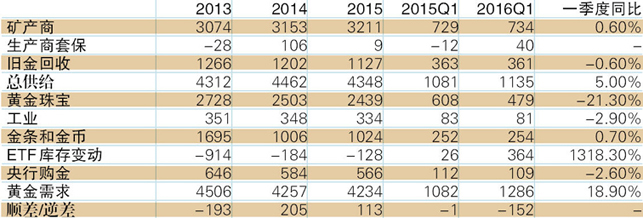 2016年一季度,黄金需求大幅增长,需求总量1,286吨,同比增长18.9%,环比增长19.8%;供给小幅增长,主要源于生产商套保卖出量增加,矿产及回收金产量则基本稳定。(表1)