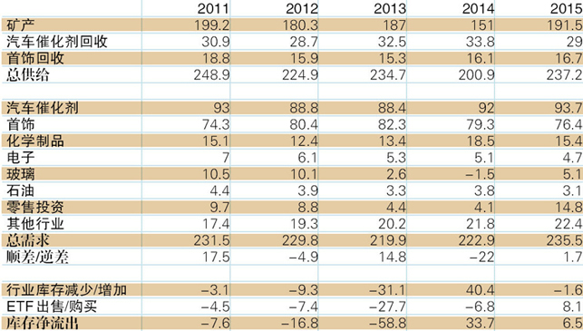 需求方面,2015年铂金需求增长5.7%至235.5吨,主要来源于零售投资需求的增长(10.7吨),几乎全部来自日本。扣除零售投资,主要工业行业需求基本平稳,略有增长。2015年钯金需求基本平稳,略有减少,催化剂需求增长8.8吨,电子行业需求下降4.6吨,首饰需求下降4.1吨。(表3)