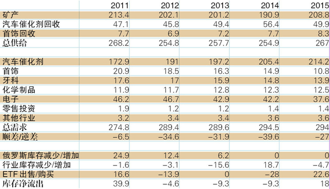 表4 全球钯金供给与需求(单位:吨)