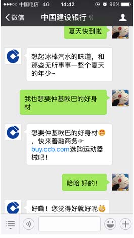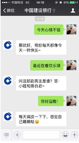 在分析大量用户交互日志的基础上,建行建立了具备建行特色的智能小微聊天库,设计大量聊天问答,涉及星座、天气、学习生活、时事新闻等方面,并根据社会热点及时更新,满足用户的聊天需求。此外,智能小微还能够最大程度挖掘用户的隐性需求,并且主动高效的满足其需求。想买手机?小微会告知用户相关优惠资讯信息。想看电影?小微会为用户提供最便捷的购票方式。小微已不仅仅是能够随时随地为用户解决问题的业务专家,更是用户的金融管家与生活伙伴。