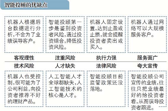 智能投顾固然有其优势,然而,毋庸置疑,它也有自己的缺点。众所周知,机器的背后是人力的支撑,智能投顾运行离不开多元化人才的密切协作,然而现实却是,高精尖人才尤其是人工智能方面的人才普遍稀缺。再有,就是这一行业初始发展之际,很难保证不会有人通过设置恶意代码,通过玩噱头,来忽悠广大的投资理财者,借机达到渔利目的。