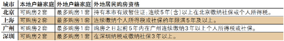 解读:从社保缴纳年限来看,北京上海均为5年,门槛最高。上海楼市原规定为,自购房之日起计算的前3年内在本市累计缴纳2年以上,现调整为自购房之日前连续缴纳满5年及以上。但与北京不同的是,非沪籍社保满5年需是非单身才能购房,而北京允许未婚人士购房。此外,深圳市政府网站发布调控政策,非深户在深圳购房,社保缴满年限由此前的1年提高至3年。