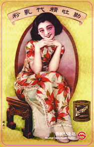 第四枚地铁纪念卡的画面,是勒吐精代乳粉的广告,画中美女双手托腮,轻启樱唇,齿如编贝,作“巧笑倩兮,美目盼兮”状,旗袍、高跟鞋、波浪卷发,画中美女娴静素雅,明艳而不妖冶。