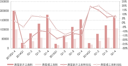 图2 2013年-2016年全国各季度累计商品房新开工、竣工面积建设情况 单位:万平方米