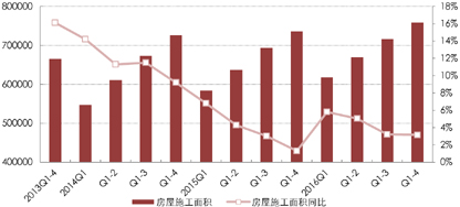 图3 2013年-2016年全国各季度累计商品房施工面积建设情况 单位:万平方米