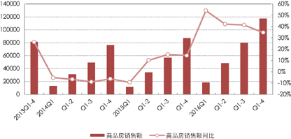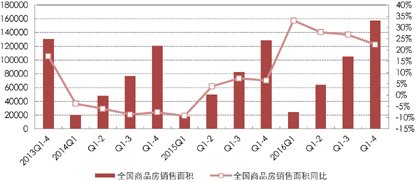 图4 2013年-2016年全国商品房季度累计销售面积情况 单位:万平方米