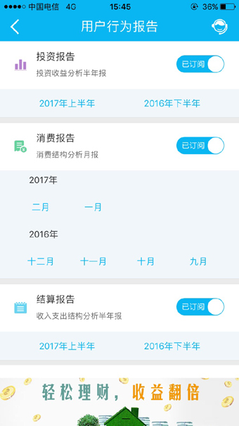 此外,财富管理功能提供“消费预算管理”和“用户行为报告”,从居家、网购、购物、出行、餐饮五大用户消费领域进行预算设置,若用户消费支出超过预算金额,建行将会及时进行消息提醒,满足用户资金使用规划需求;从投资、消费、结算三大维度详细分析用户各阶段资金流水情况,全面掌握个人资产收支状况。