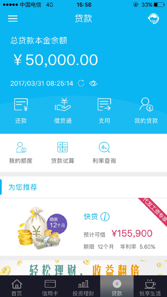 首页、信用卡、投资理财、贷款、悦享生活五大主导航菜单,将用户关注的服务功能通过小图标菜单的形式部署于各个导航菜单第一屏,入口前移,访问流程简化,用户两步内就能到达所需页面。