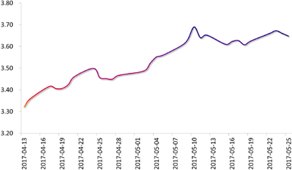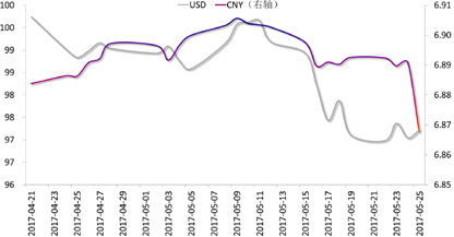 外汇市场:上周,特朗普解除科米职务令投资人对美国政局的担忧加剧,市场认为其税改和基建进度都将受到牵连,美元指数明显下行。受益于此,人民币兑美元当周上涨0.36%。