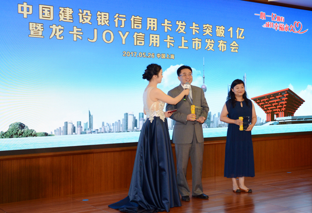 图为建行信用卡第一位持卡人陈衡先生,和第一个亿持卡人黄莎斐女士,建行为两位持卡人颁奖并采访。■ 曹恒枢 桐彤/图文
