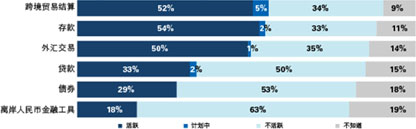 •  未来两年,预计受访企业当中有31%的境内公司超过20%的国际贸易业务将使用人民币结算