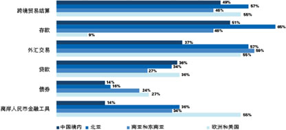 调查发现,北亚公司普遍在境外持有人民币存款,但是很少有欧洲和美国的公司这样做。但是欧洲和美国的公司会更多地使用人民币开展外汇交易以及使用离岸人民币金融工具。