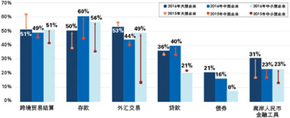 •  2016年,使用人民币进行交易的中小型企业占比从38%增至51%,而大型企业使用人民币进行交易的数量相比2015年有所减少
