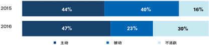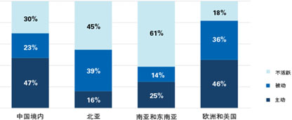 在受访的境外公司中,北亚受访者更加被动,而欧洲和美国的受访者更加主动。尽管多个自由贸易协议的签订使贸易流日益增长并使贸易关系更加紧密,南亚和东南亚的受访者在人民币计价贸易这个领域的表现并不积极——61%的南亚和东南亚受访者认为他们不主动也不被动,他们对此不感兴趣。(图12)