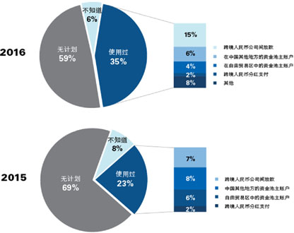 今年的调查结果和2015年的调查结果对比显示境内公司使用人民币进行跨境贸易结算的数量有所减少。