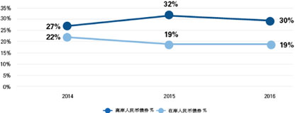 •  自2015年以来,使用离岸人民币存款的境内公司的数量有所增加(从2015年的33%增至2016年的51%)