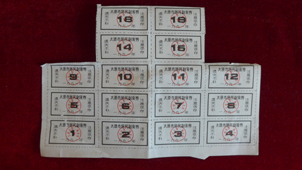 上世纪九十年代初,不经意间,所有的票证突然不见了。人民的生活发生了巨大的变化,人们不再为吃穿发愁了。现如今不要说大超市大商场的琳琅满目了,吃粗粮也成改善生活了,不要说电话机了,手机、电脑都一人几台了,不要说半导体收音机了,电视机都几十吋的超薄大镜面带3D4K了。自行车都成健身器材了,手表、金银都不爱戴改戴木头手串了,汽车都差不多一家一辆了。返回头看看这曾经使用了四十年的票证,想想因为它曾经发生过的哭哭笑笑的故事,怎不叫人百感交集、思绪万千呢。(山西省分行)