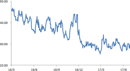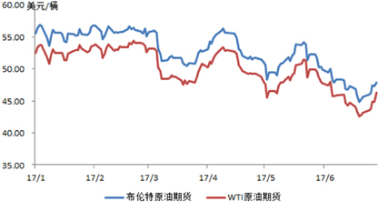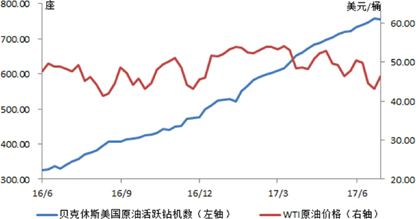 传统产油国减产协议执行情况和美国页岩油增产之间的博弈,主导了2017年上半年油价的波动。年初,OPEC减产协议落实,油价高位震荡在50-55美元/桶间。3月,俄罗斯未进一步减产以及沙特增产消息刺激,大量投机性多头一度撤离市场,油价启动大跌;市场情绪平复后修复性反弹至4月,在美国页岩油增产超预期实质性利空影响下,油价再度下跌至44美元/桶下方;5月受OPEC延长减产协议刺激,油价一度回升至50美元/桶,但市场深度解读后发现,减产力度并未增加,同时豁免国利比亚、尼日利亚的产量恢复,美国方面持续增产,油价再次下跌至42美元/桶附近,创年内新低,6月末油价稍有反弹。(图1)