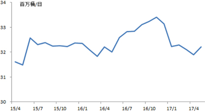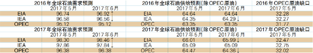 全球经济稳步复苏,一季度经济增长超预期,OPEC预计下半年仍将保持积极增长势头,并上调2017年预期经济增长率至3.4%。具体而言,OECD国家经济或将保持前半年平稳增长态势;发展中国家经济情况各异:中国经济增长放缓;印度上半年经济增长受废钞令影响,下半年将有所复苏;俄罗斯和巴西在下半年经济增长情况或将好于上半年。全球原油需求增加仍保持原估计,增加1.27md/d至96.38md/d。随着全球夏季原油需求旺季影响,下半年原油需求将稍有改善。