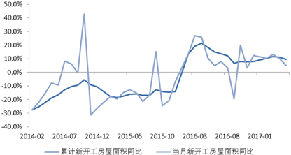 房屋新开工方面,同比增速一改去年高歌猛进的状态,整体呈现温和增长态势,从累计数据和月度对比分析可以发现,二者均已拐头向下,其中月度同比增速已经低于累计同比增速,意味未来新开工面积增速进一步下行概率增大。具体数据显示,1-5月累计新开工面积同比增长9.5%。