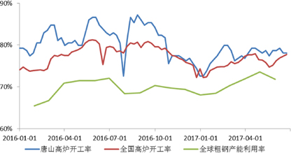 产能利用率方面,国内高炉开工率整体维持高位,带动全球产能利用率上升。上半年,钢铁主产区唐山地区的产能利用率始终维持在78%左右的高位,全国产能利用率在4-5月一度有所下滑,但5月中旬开始迅速止跌,再度攀升。