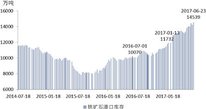 数据显示,我国铁矿石进口继续增长,一季度同比增速高达两位数,二季度有所放缓,1-5月累计进口铁矿石同比增长7.9%;库存方面,6月末我国港口铁矿石库存达到了接近1.5亿吨的历史峰值,同比增幅接近50%。(图12)
