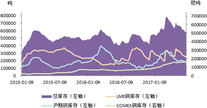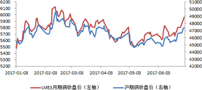 2月下旬至5月中旬,铜价震荡下行。2月下半月,在美联储官员连续的鹰派言论打压下,铜价回落并开启了长达一个季度的下行;3月,伦铜库存大增且美联储加息预期陡增,压制铜价;4月,中国金融去杠杆成为市场关注焦点,且美联储缩表预期上升,资金面预期收紧,同期特朗普税改方案不如市场预期,“特朗普交易”行情告一段落;5月,国内利率上扬、资金面持续收紧,LME铜库存也连续大增。震荡下行中,铜矿罢工等供给端扰动明显,铜价间有反弹。