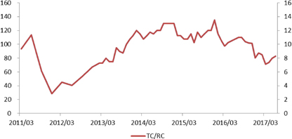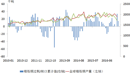 结合供给端分析,供需呈现紧平衡,需求下滑更明显。供需平衡表显示,过去的半年铜市场基本处在一个紧平衡状态,累计缺口很小。今年虽然铜供给出现下滑,但是需求下滑的程度更大,使铜供应上半年没有明显缺口,2017年前4月,铜市场供应小幅短缺5000吨。(图16)
