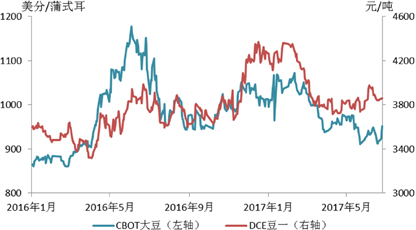 2017年上半年,美豆冲高后大幅下挫,开于1004美分/蒲式耳,收于952.25美分/蒲式耳,上半年跌幅5.15%。。1-2月美豆震荡上涨,3月大跌超8%,4-5月窄幅震荡盘整后,再度大幅下跌,6月跌至900美分/蒲式耳后筑底,顽强守住900美分/蒲式耳关口。