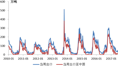 5月18日,巴西总统贪腐事件导致雷亚尔兑美元汇率当日暴跌近8%,极大刺激巴西农户销售大豆积极性,单日大豆销售量超过200万吨,远高于近期的30-40万吨水平及去年同期的60万吨左右水平,巴西大豆出口贴水走弱,下跌10美分/蒲式耳。