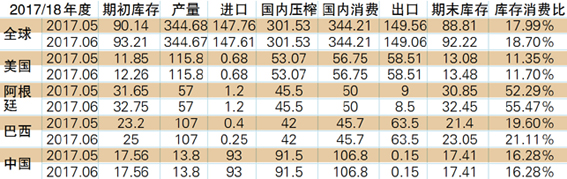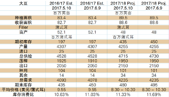 美豆种植面积预测沿用3月31日意向报告的数据8948万英亩,较上年增加600万英亩至创纪录新高;单产预测沿用上月报告中的预估数据48蒲式耳/英亩;唯一的变化来自于期初库存,由于2016/17年度期末库存上升0.15亿蒲式耳,相应增加总供给以及库存消费比。期初库存受上一年度期末库存上升影响而有所增加,期末库存相应调整至4.95亿蒲式耳。由于需求方面无调整,因而库存消费比较5月的预估11.33%上升0.36个百分点至11.69%。(表3)