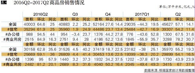 投资:开发投资增幅上了新台阶。房地产投资月度累计增幅2016年下半年是5.3-6.9%区间,今年上半年8.5-9.3%区间。平台上移,波幅降低。上半年住宅中的大面积房型投资增幅高于其他商品房。投资指向鲜明。投资增幅144平方米以上住房是13.6%,其中高档公寓和别墅是15.5%;而90平方米及以下住房则是-7.7%;办公楼和商业营业用房则分别是4.8%和5.0%。