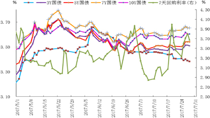 2017年7月7天回购利率月度中枢较6月的3.46%下行29BP至3.17%,存款类机构质押式回购利率月度中枢较6月下行12BP至2.81%,3个月SHIBOR较6月末下行24BP至4.26%。