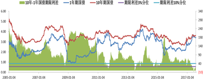 期限利差处于历史极低位置,期限结构存在修复压力。截止7月31日,10年期与1年期国债期限利差仅为22BP,依然处于历史3%分位数的极低水平,未来期限利差仍有拓宽的压力。历史上两次利率调整期,期限利差极低的情况,均发生在调整末期,分别为2011年底和2014年初(2013年6月的期限利差倒挂是市场出现了流动性危机)。随后期限结构的修复均在市场资金面转向后,通过短期利率下行完成。需要强调的是,期限结构修复期间货币政策并未明显转松,只是政策的边际转向,资金面稳定后,期限利差自然修复。(图4)