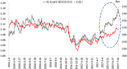 图6 欧元走势与欧美10年期国债利差对比