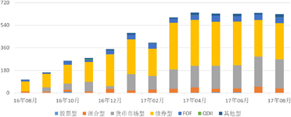 从产品类型看,股票型产品260款,平均月度收益率为2.43%;混合型产品1075款,平均月度收益率为0.77%;FOF产品598款,平均月度收益率为0.33%;债券型产品2734款,平均月度收益率为0.18%;货币市场型产品998款,平均月度收益率为0.06%;QDII产品39款,平均月度收益率为0.04%;其他型产品119款,平均月度收益率为0.37%。(图10)