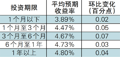 时值三季度末,市场资金面再次趋紧,银行理财产品收益率也出现上升,达到近一年以来的新高。本月人民币银行理财产品的平均预期收益率为4.60%,环比上升0.05个百分点。各期限类型理财产品收益水平均出现微幅上涨,其中3-6个月期限类型涨幅最高,为0.07个百分点。(表1)