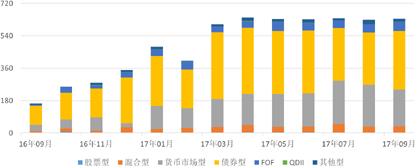 其中,债券型产品发行了326款,环比增加37款,升幅为12.80%,平均首发规模6.31亿元,环比增加1.40亿元,升幅为28.46%;货币市场型产品发行了204款,环比减少28款,降幅为12.07%,平均首发规模1.81亿元,环比减少0.84亿元,降幅为31.74%;FOF产品发行了49款,环比增加3款,升幅为6.52%,平均首发规模13.04亿元,环比增加3.80亿元,升幅为41.08%;混合型产品发行了37款,环比增加1款,升幅为2.78%,平均首发规模18.33亿元,环比增加3.14亿元,升幅为20.64%; QDII产品发行了2款,环比增加1款,升幅为100.00%;其他型产品发行了16款,环比减少8款,降幅为33.33%,平均首发规模15.00亿元,环比减少22.81亿元,降幅为60.33%。(图9)