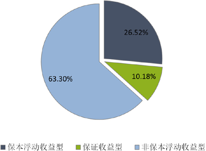 从收益类型来看,保证收益型产品发行了839款,环比减少215款,市场占比下降0.59个百分点至10.18%;保本浮动收益型产品发行了2185款,环比减少377款,市场占比上升0.33个百分点至26.52%;非保本浮动收益型产品发行了5215款,环比减少952款,市场占比上升0.26个百分点至63.30%。(图1)