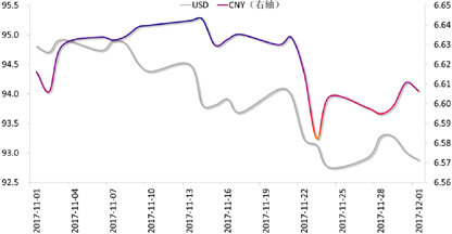 外汇市场:上周,欧元继续走强,美元指数承压,在93附近窄幅波动。人民币汇率市场上,由于临近年末,市场购汇需求有所增加,人民币兑美元即期市场成交价小幅下跌,周五收于6.6065,当周微贬0.04%。