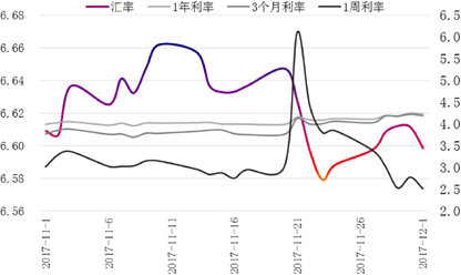 离岸人民币市场:上周,美元指数主要在93附近波动。离岸人民币也维持窄幅波动,周四兑美元曾跌至6.628,周五略为转强,全周兑美元只有约400点左右的波幅。短期掉期点相对平稳,偏长期限3个月至1年的掉期点则因年底及跨年等因素有继续走高的趋势。
