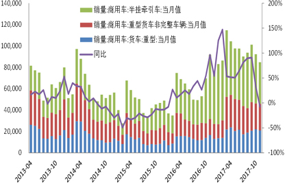 今年重卡销量持续超市场预期,去年国家标准修改了半挂车最大载重,运力不足所带来的增量需求与上一轮2010年重卡周期的替换需求叠加导致今年重卡销量高增长。但11月重卡销量同比下降7.65%,高增长时代已经过去,明年销量增速将显著下滑。从政策来看,2017年10月1日起,“2+26”个城市及山西、河南省成品油已升级到国六标准,普柴升级“国五”标准的时间也由2018年1月1日提前至2017年11月1日,这部分的替换需求在今年也已被释放。