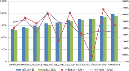 全球油脂产量和需求均保持稳定增长趋势,但产量增速略高于需求增速。2017/18年度全球油脂总产量为19688万吨,较2016/17年度增加829万吨,增幅为4.40%;2017/18年度全球油脂总需求量为18994万吨,较2016/17年度增加617万吨,增幅为3.36%。从近5年的全球九大油脂产量数据来看,棕榈油是世界上生产和消费最多的食用油,在全球总油脂中的占比维持在35%左右,其次是大豆油占到28.55%。分品种来看,产量的增幅主要还是集中在棕榈油、大豆油,2017/18年度棕榈油产量增加了453万吨,大豆油增加了234万吨,两者合约687万吨,占总产量增幅的82.87%。因此,在2017/18年度油脂供应端棕榈油和豆油产量的变动情况对行情走势至关重要。(图8)