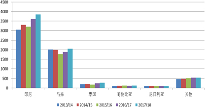 图9 全球棕榈油主产国近五年产量走势图(万吨)