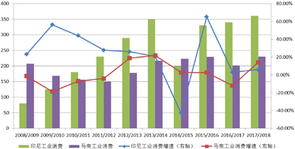 图10 2000年至今马来和印尼工业消费产量和增速走势图(万吨)